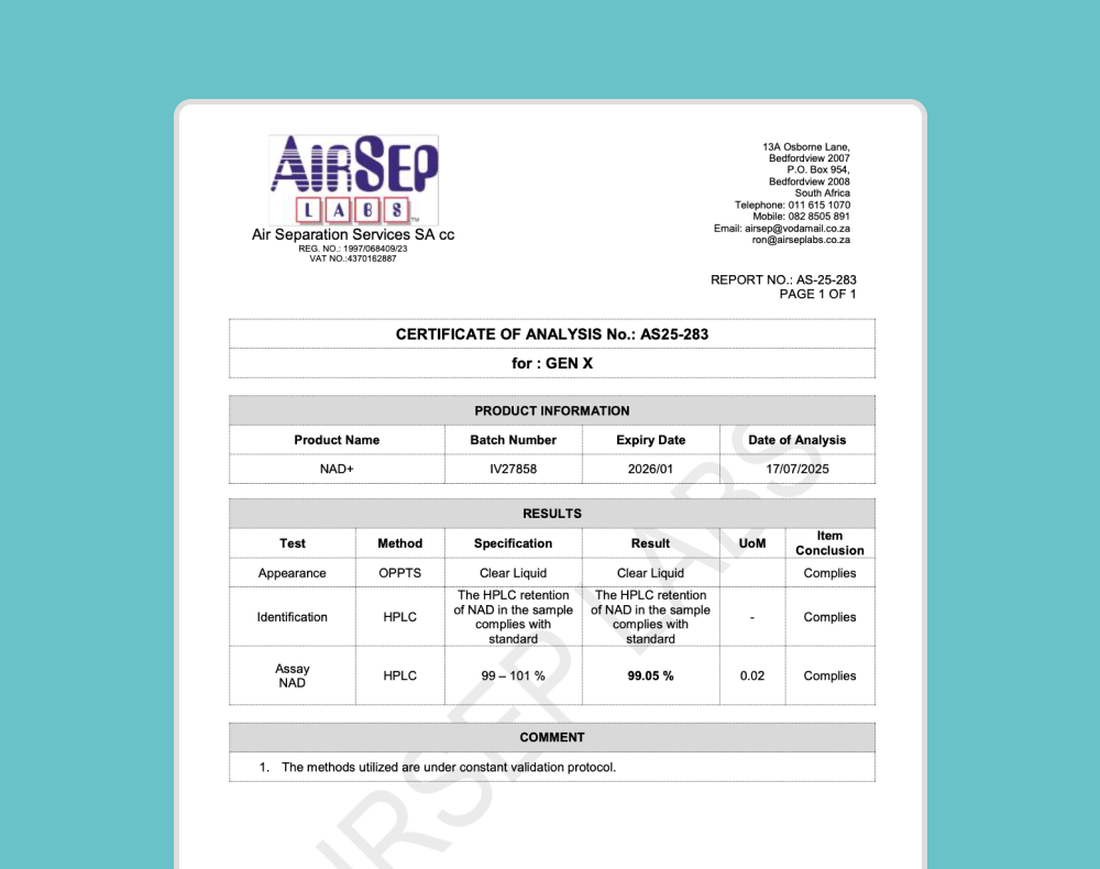 NovaNAD+ has been tested by an accredited independent laboratory to verify the identity and purity of our NAD+ formulation. Using HPLC analysis, results confirmed clear liquid appearance and 99.05% assay compliance.